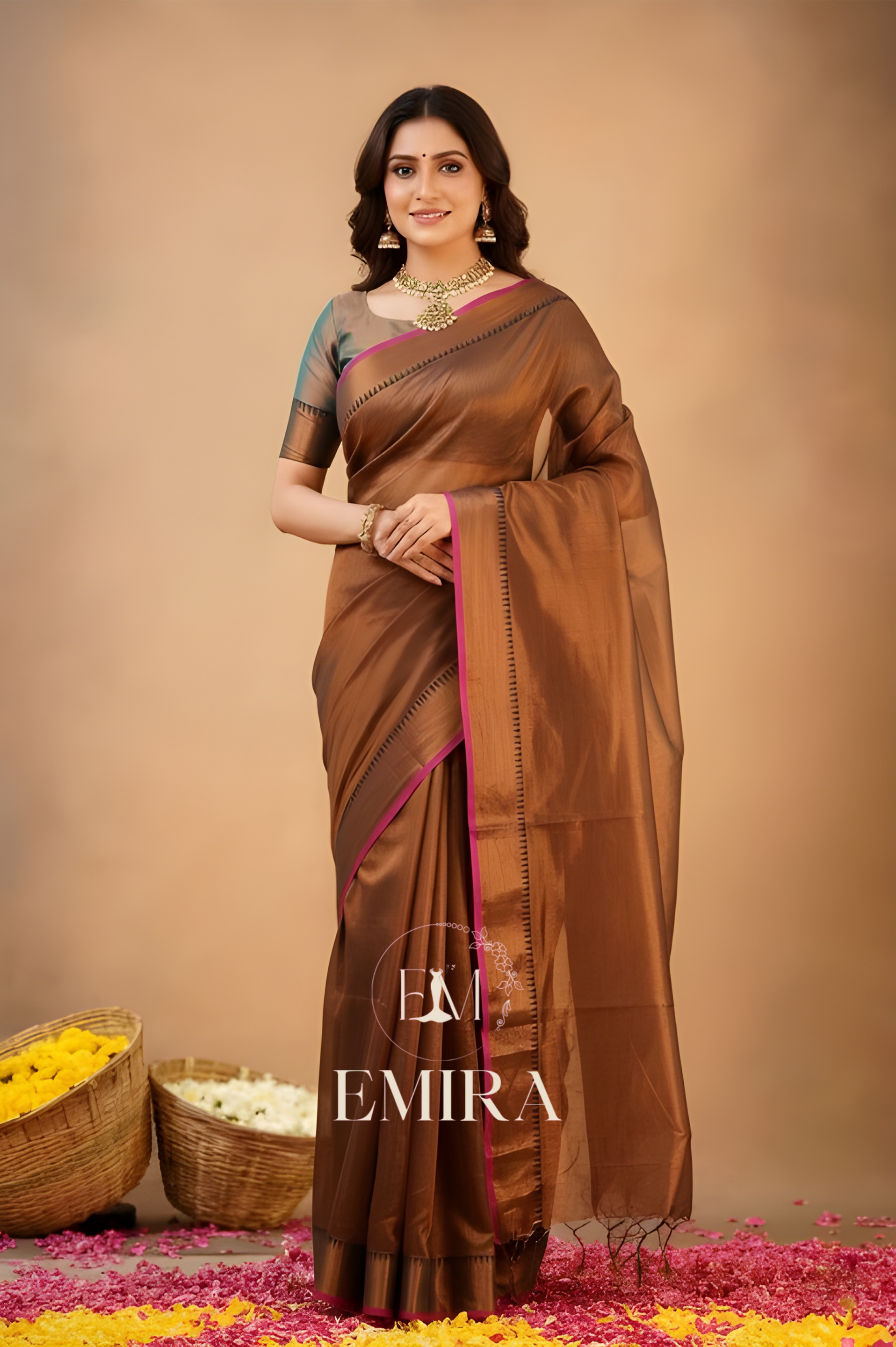 The Tissue Cotton Saree: A masterpiece born from tradition, woven with care, it captures the essence of elegance and ambition. Its delicate threads sing melodies of heritage and pride, a symbol of India's rich culture, cherished far and wide.